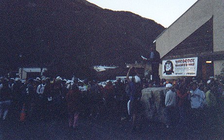 July 9, 6:00 AM. Runners await the start in Silverton as Dale Garland, standing on the hardrock, gives last minute instructions.