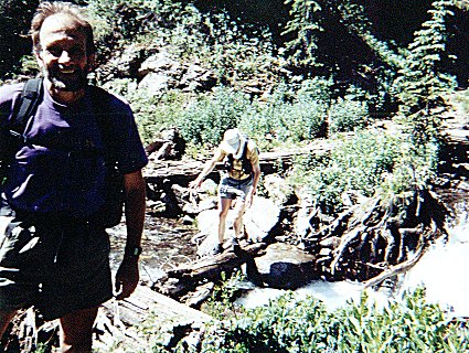 Mile 13, crossing below the Ice Lake basin waterfall on wobbly logs.