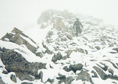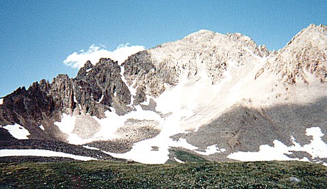 The next day (July 1), I climbed La Plata (14,336 ft) in better weather by Ellingwood ridge, a long class 3 route. Actually it is 90% class 2+ or less, but the other 10% will occupy half your time. I started from the Lake Creek trailhead at 7:00 AM, reached the summit at 2:46 PM, and returned via the easy NW ridge trail route at 4:50 PM. Although Roach describes Ellingwood Ridge as a classic route, it is not very popular. I did not see any sign of a trail once on the ridge, nor did I see a single hiker, cairn, or human footprint on the route. (I did see mountain goat and marmot tracks in the snow). The best route is mostly 50-100 ft below the top of the ridge on the left side.