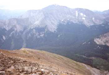 The steep descent down Columbia's south ridge, with Yale in the background. It is not possible to walk down. Instead you have to slide down scree to treeline.